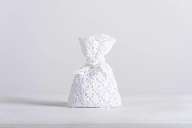 Το πλεκτό πουγκί αποτελεί βάση για μια κομψή και ιδιαίτερη μπομπονιέρα.