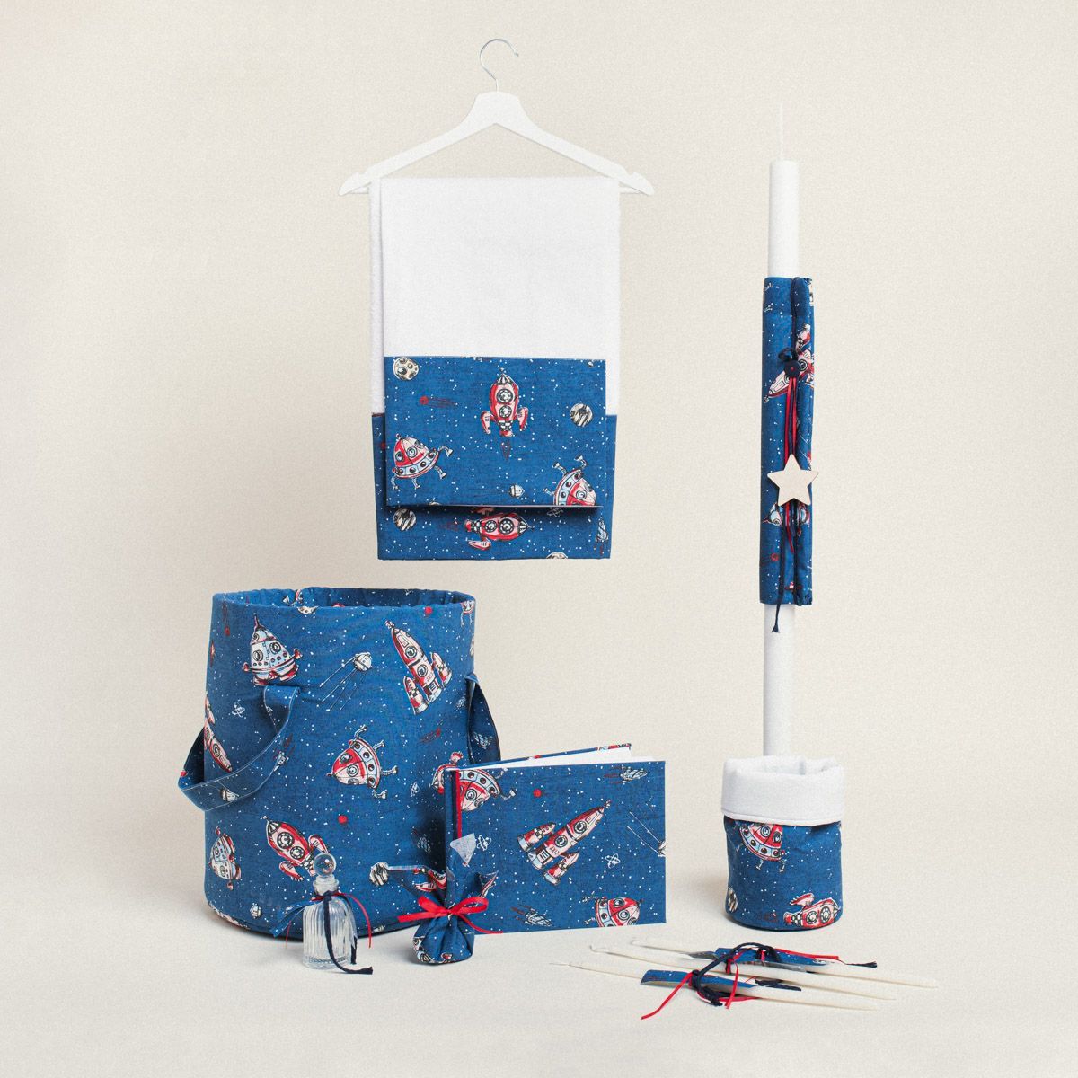 Ένα εξαιρετικά δημιουργικό σετ βάπτισης με θέμα τα διαστημόπλοια, ιδανικό για μια βάπτιση γεμάτη φαντασία και περιπέτεια στον αχανή κόσμο του διαστήματος.