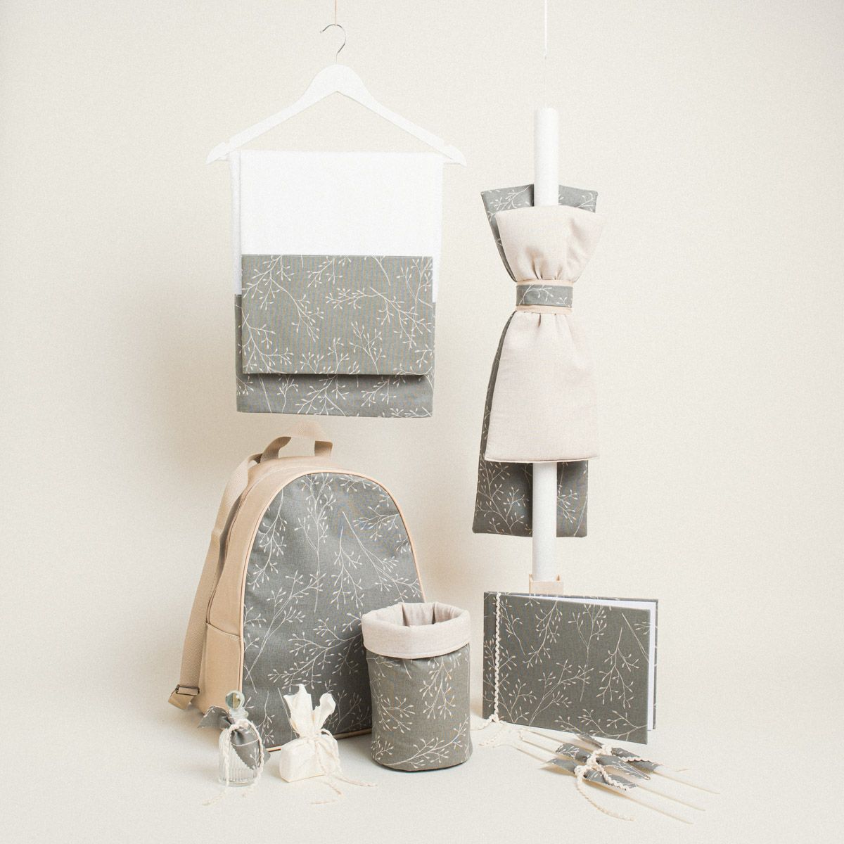 Ένα κομψό και φυσικό σετ βάπτισης με κλαδιά και λαδί φόντο, ιδανικό για μια ήρεμη και μοντέρνα βάπτιση.