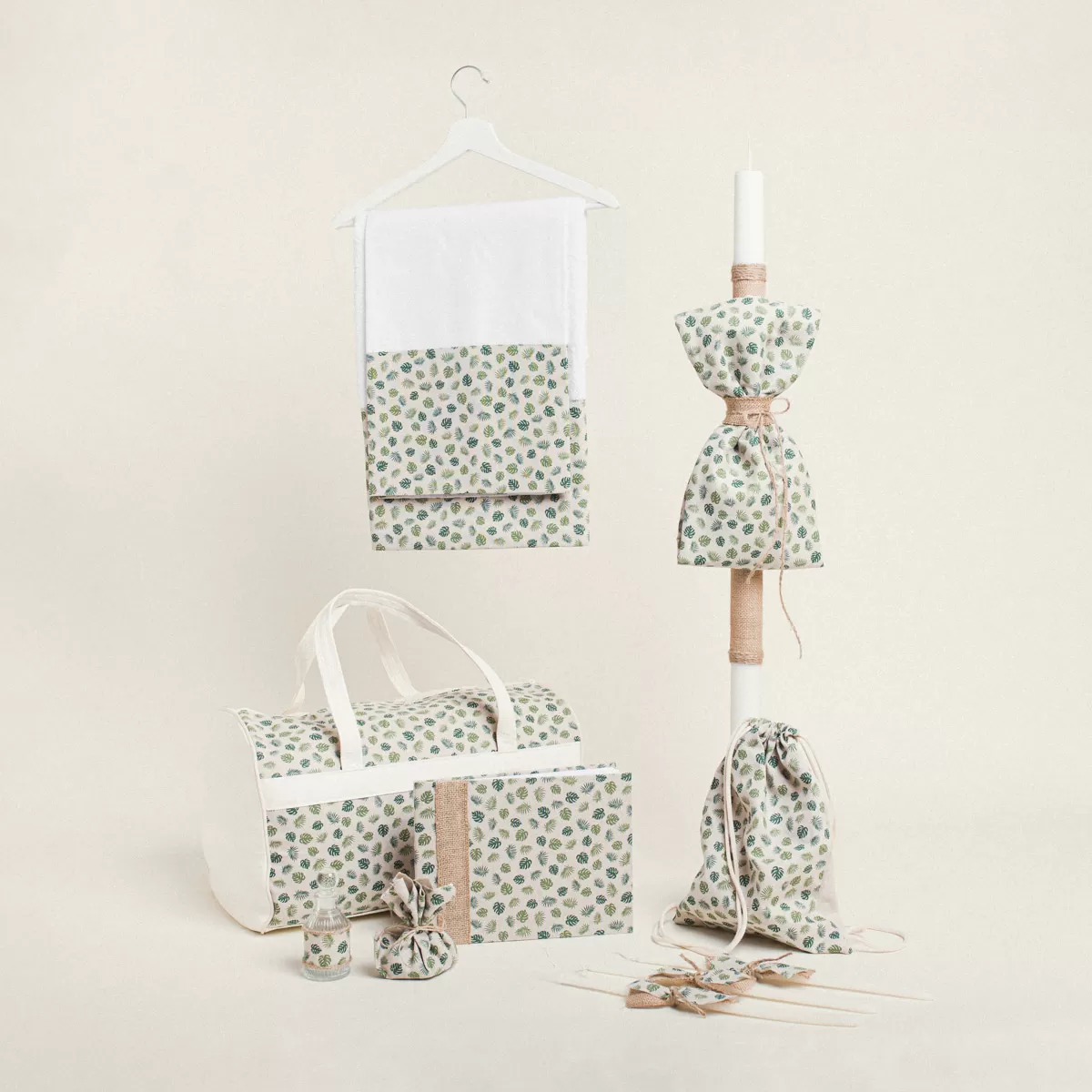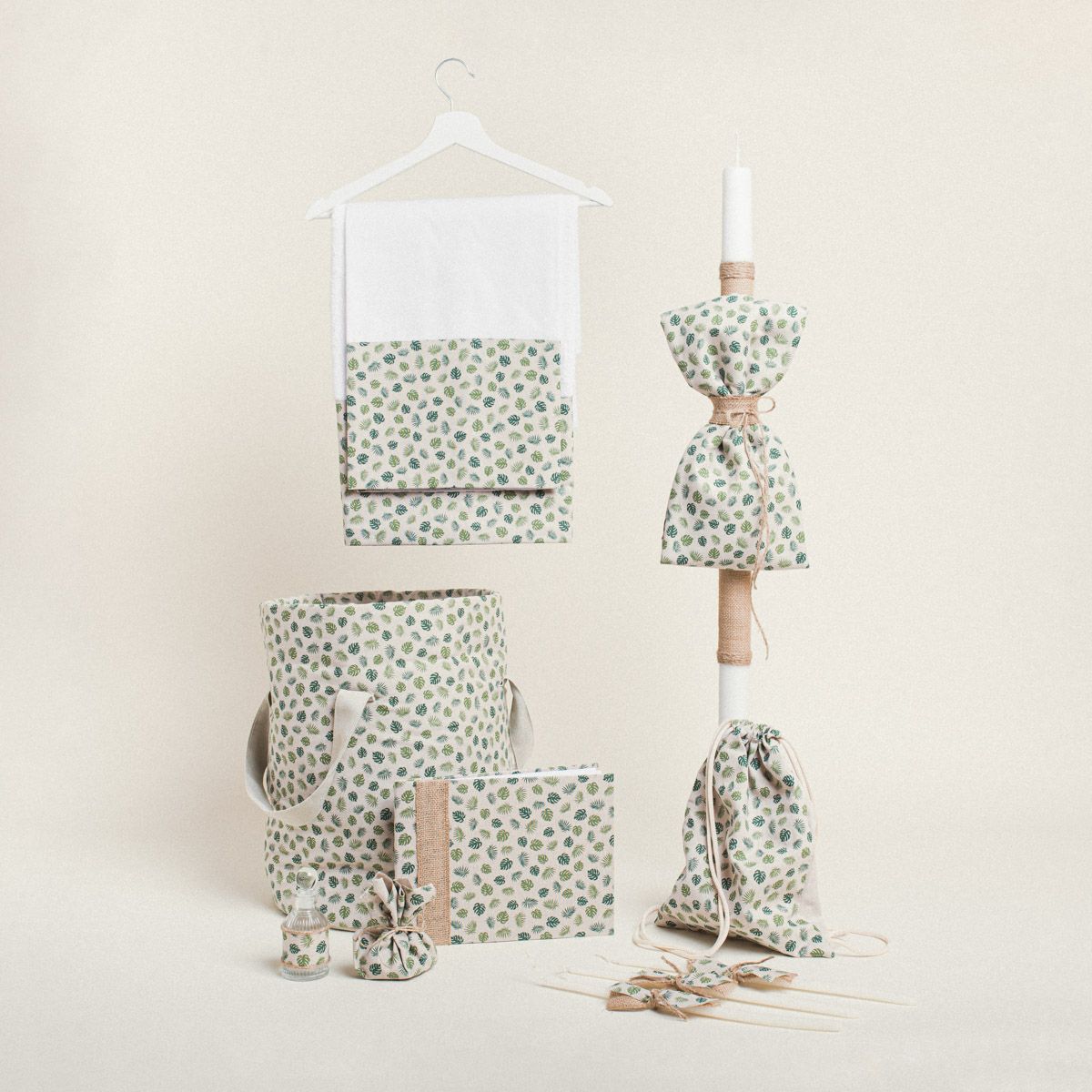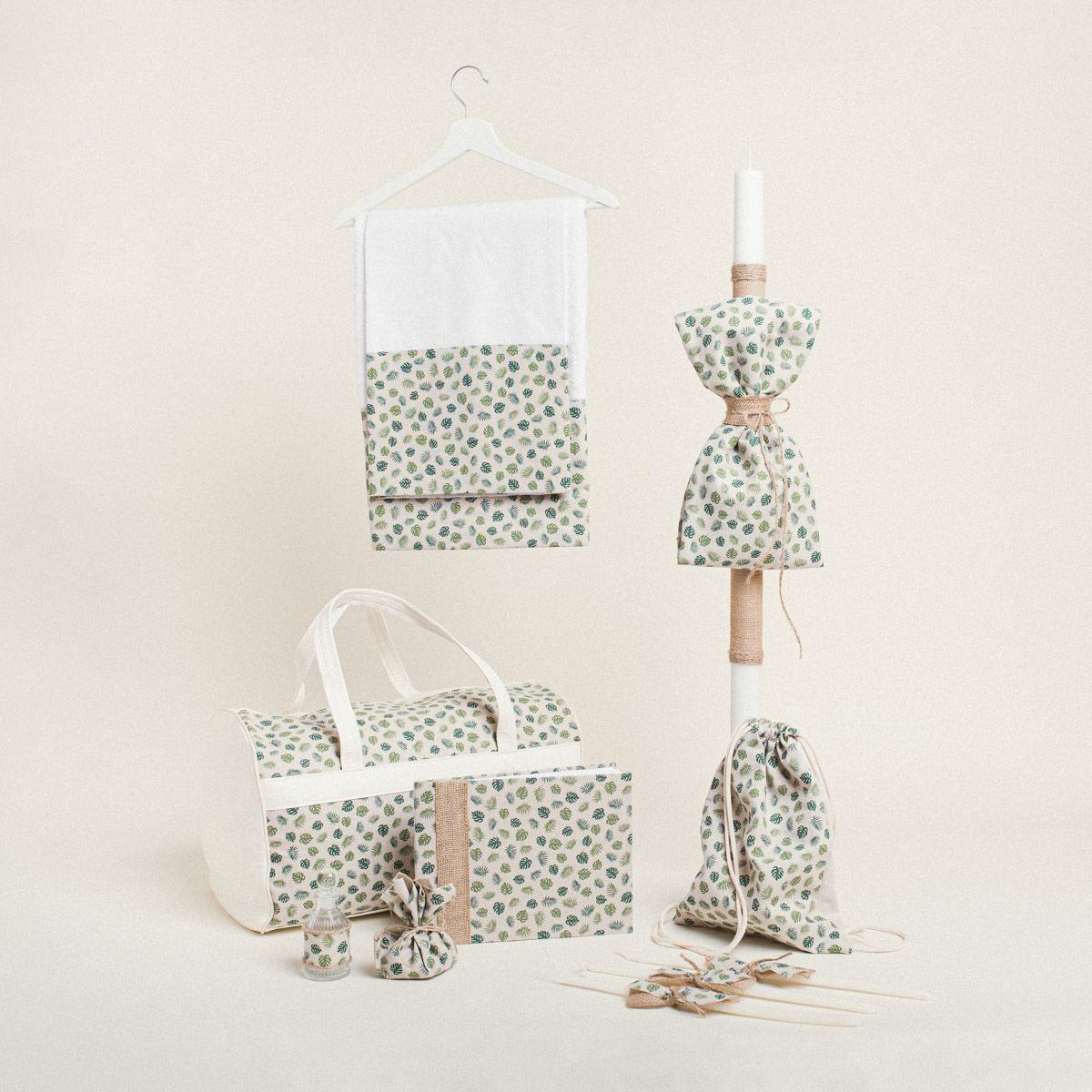 Ένα κομψό και μοντέρνο σετ βάπτισης με σχέδιο τα φυλλά της Μονστέρα, ιδανικό για μια φυσική και στιλάτη βάπτιση.