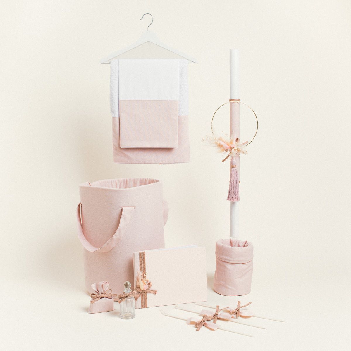 Ένα κομψό και ρομαντικό σετ βάπτισης με στεφάνι σε ροζ και χρυσές αποχρώσεις, διακοσμημένο με αποξηραμένα λουλούδια, ιδανικό για μια βάπτιση γεμάτη φυσική ομορφιά και αίσθηση πολυτέλειας.