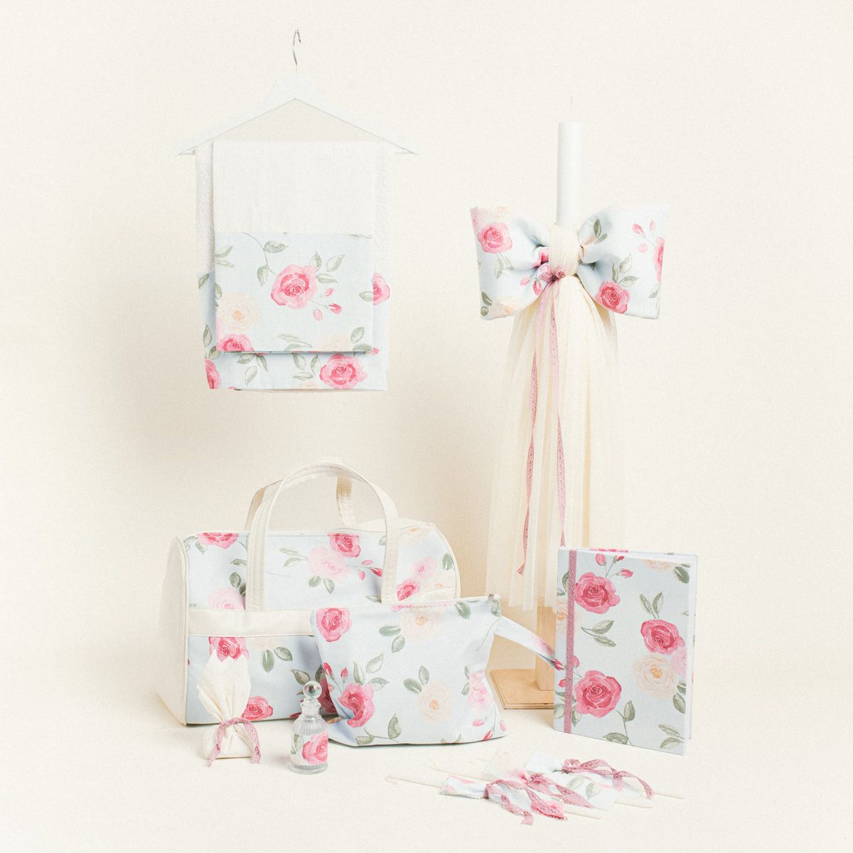 Ένα ρομαντικό και λουλουδάτο σετ βάπτισης με θέμα τα τριαντάφυλλα σε γαλάζιο φόντο, ιδανικό για μια βάπτιση γεμάτη κομψότητα και αθωότητα.