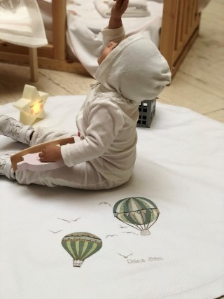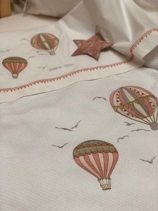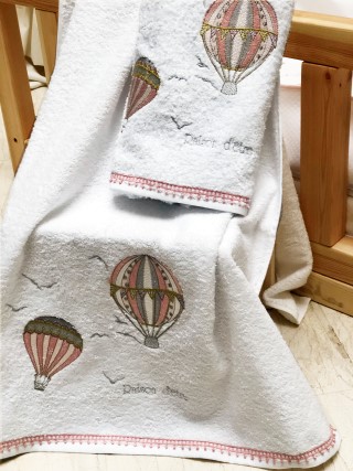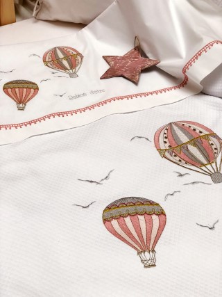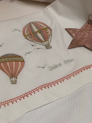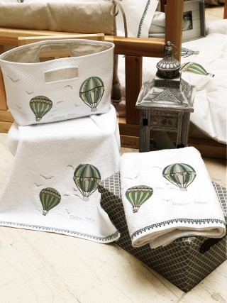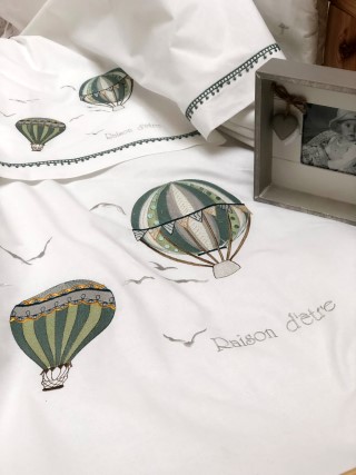 Κεντημένη βρεφική προίκα μωρού Raison D’être – Hot Air Balloon σε ιδιαίτερη ξύλινη συσκευασία.
