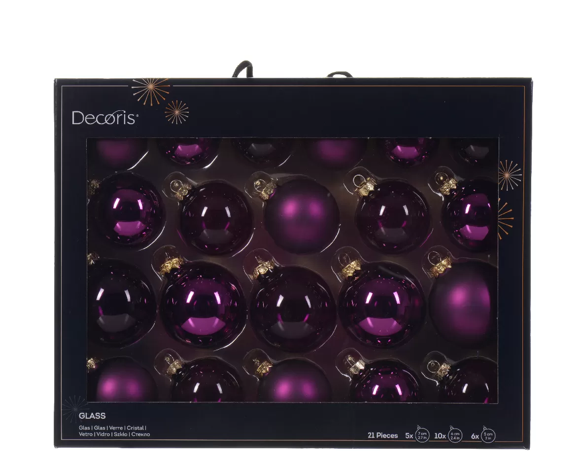 Δώστε λάμψη και πολυτέλεια στο χριστουγεννιάτικο δέντρο σας με τις ιδιαίτερες μπάλες σε βιολετί απόχρωση.