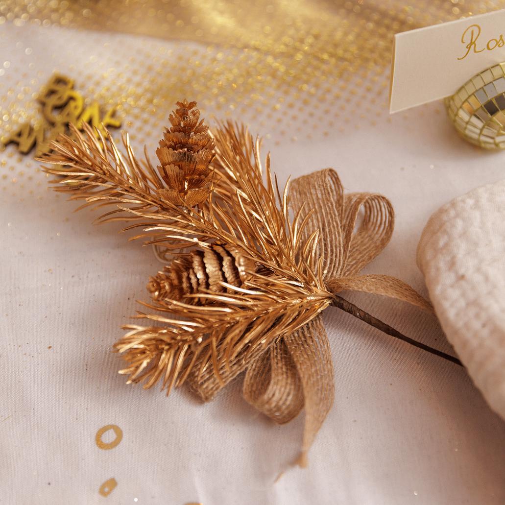Εντυπωσιάστε τους καλεσμένους σας με τις χρυσές μας διακοσμήσεις και τον φιόγκο από λινάτσα. Τοποθετημένο απαλά σε ένα πιάτο ή σε ένα από τα μικρά μας βάζα, αυτό το κλαδί θα ταιριάξει ιδανικά με τη διακόσμησή σας. Διαστάσεις: 19 cm.