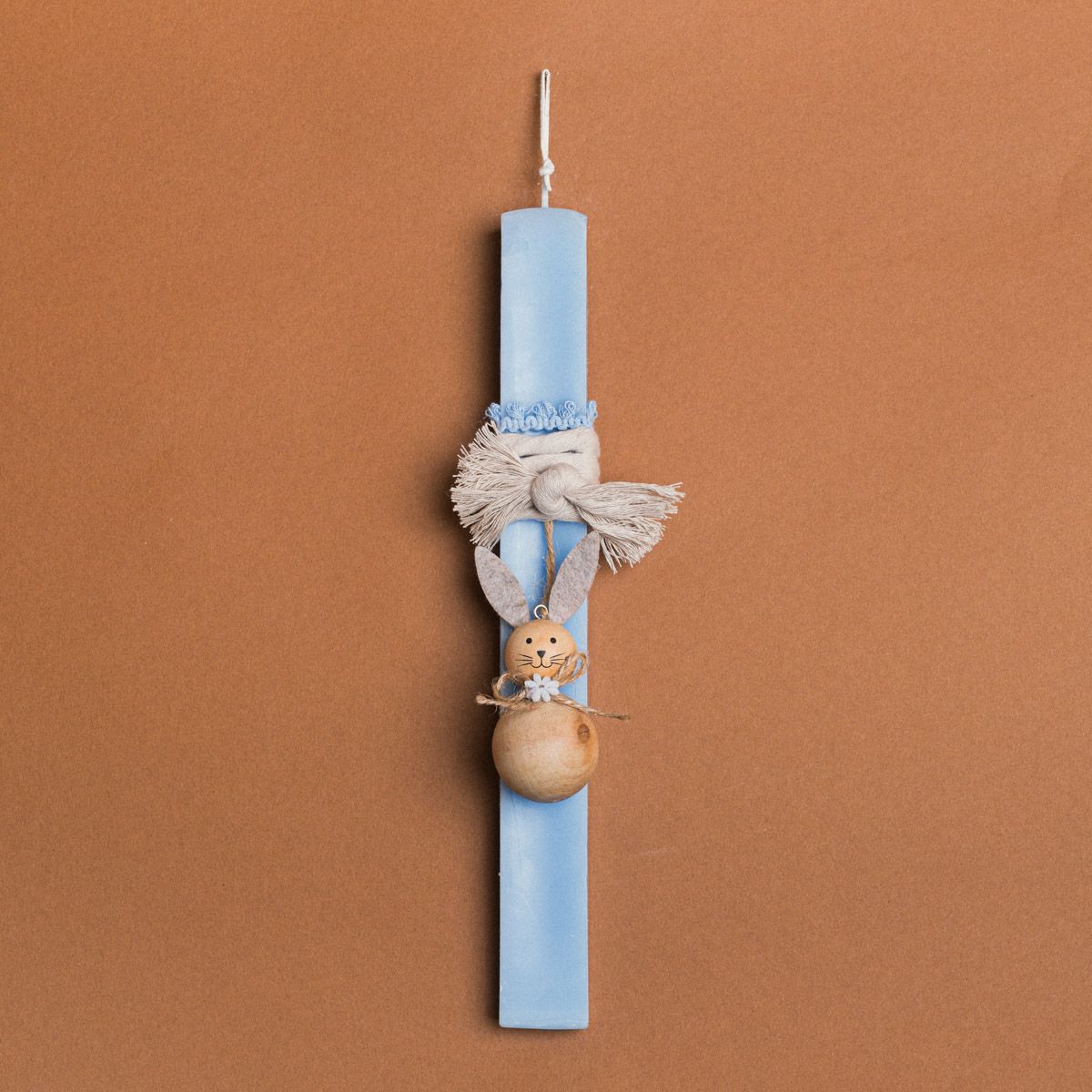 Χειροποίητη λαμπάδα σε σιέλ χρώμα, ιδανικό δώρο για το Πάσχα. **Περιλαμβάνει κουτί δώρου**, έτοιμη να προσφερθεί στους αγαπημένους σας.