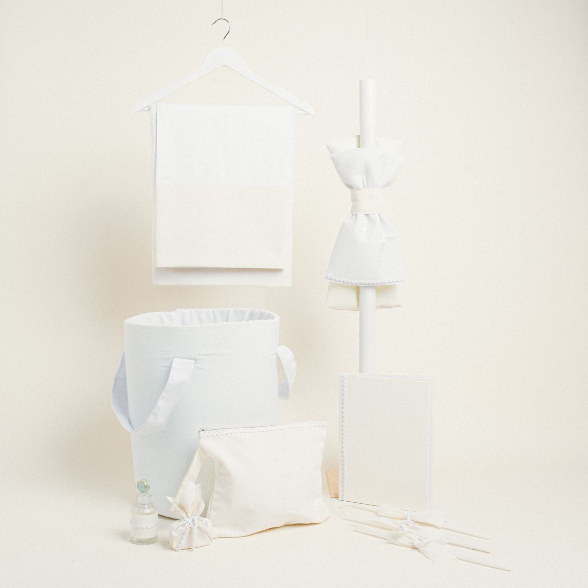 Ένα κομψό και ολοκληρωμένο σετ βάπτισης σε εκρού απόχρωση, ιδανικό για μια ξεχωριστή βάπτιση.