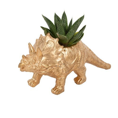Δώστε μια ξεχωριστή πινελιά στη διακόσμησή σας με αυτό το εντυπωσιακό βάζο σε σχήμα Τρικεράτοπα. Με κομψό χρυσό φινίρισμα, είναι ιδανικό για μικρά φυτά ή διακοσμητικά στοιχεία. Διαστάσεις: 10 x 21 x 6,5 cm.