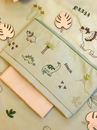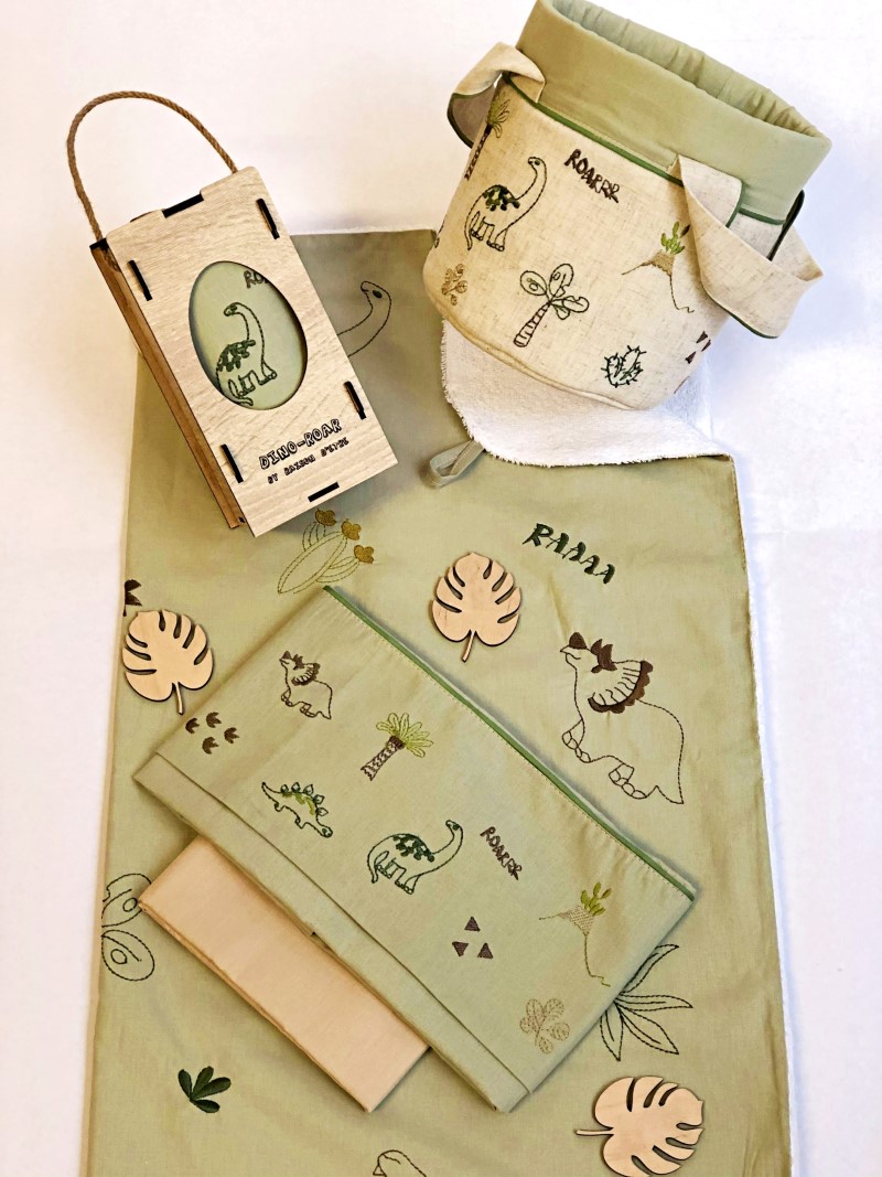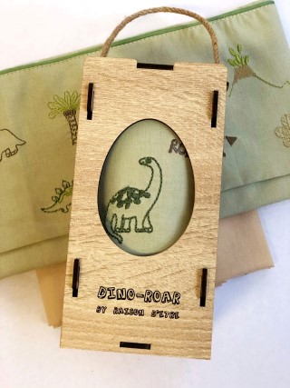 Κεντημένη προίκα μωρού Raison D’être “Dino – Roar” σε ιδιαίτερη ξύλινη συσκευασία.