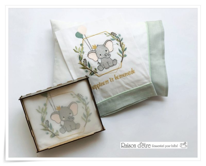 Κεντημένη βρεφική προίκα μωρού Raison D’être – “Dream Big Elephant” σε ιδιαίτερη ξύλινη συσκευασία.