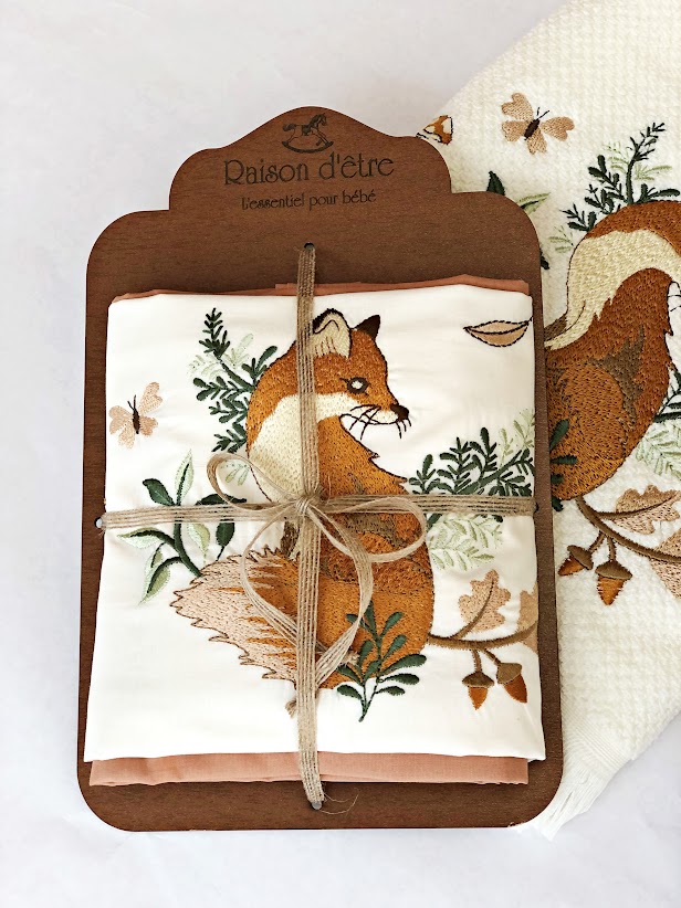 Κεντημένη βρεφική προίκα μωρού Raison D’être – “Fox In The Pine” σε ιδιαίτερη ξύλινη συσκευασία.